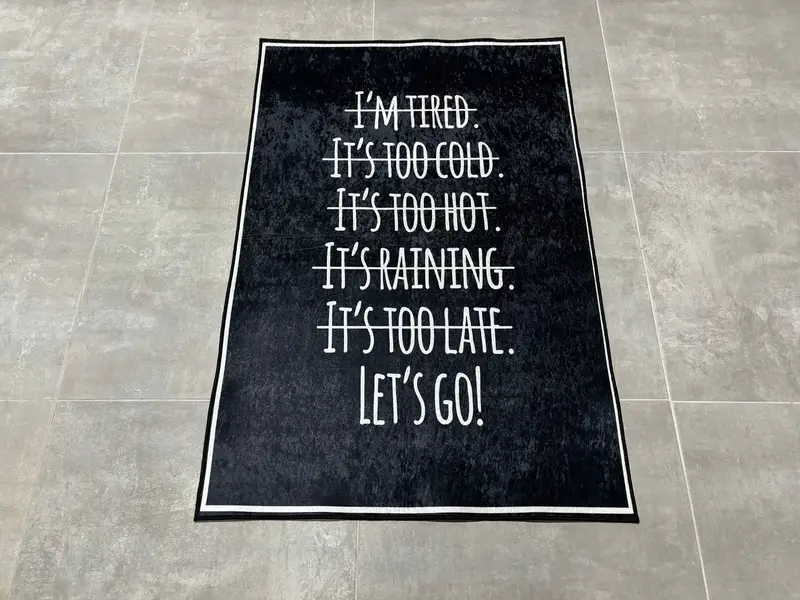 室内装飾用のモチベーションを高める引用文が描かれたブラックのプリントラグ