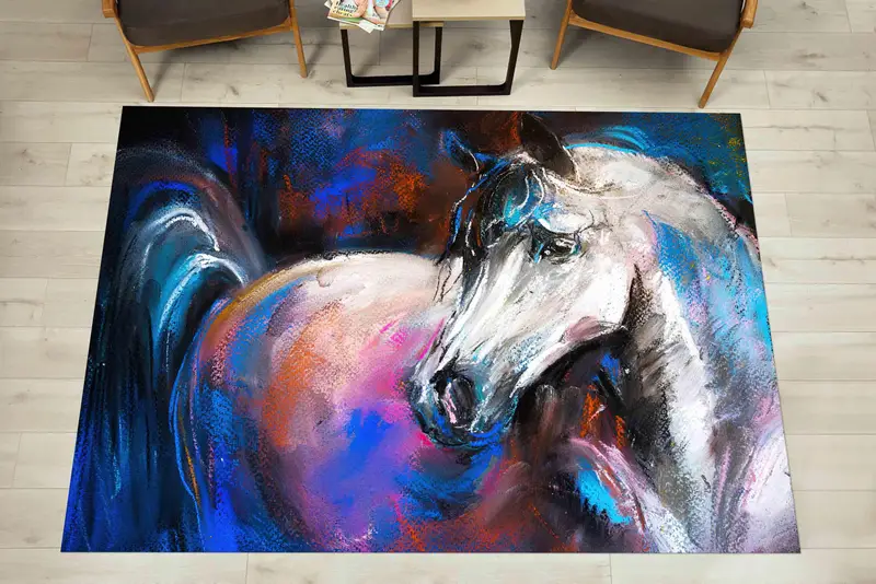 ホワイトホースアブストラクトプリントラグ:馬愛好家のためのモダンなインテリア