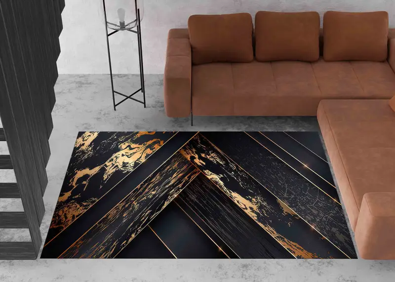ブラック & ゴールドのモダンな抽象プリント ラグ、豪華なホーム アクセント