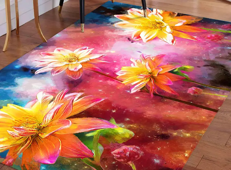 鮮やかな花柄プリントラグ: モダンな抽象花柄デザイン