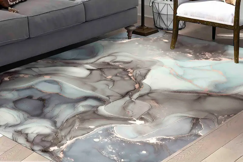グレー & ブルーの大理石のコンテンポラリー プリント ラグ、豪華なきらめくデザイン