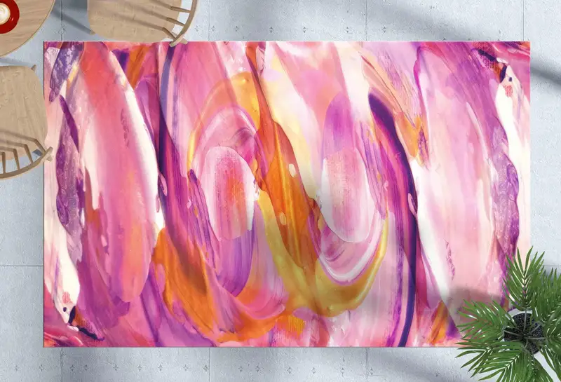 現代的な空間にぴったりの鮮やかなピンクとパープルのモダンなプリントラグ