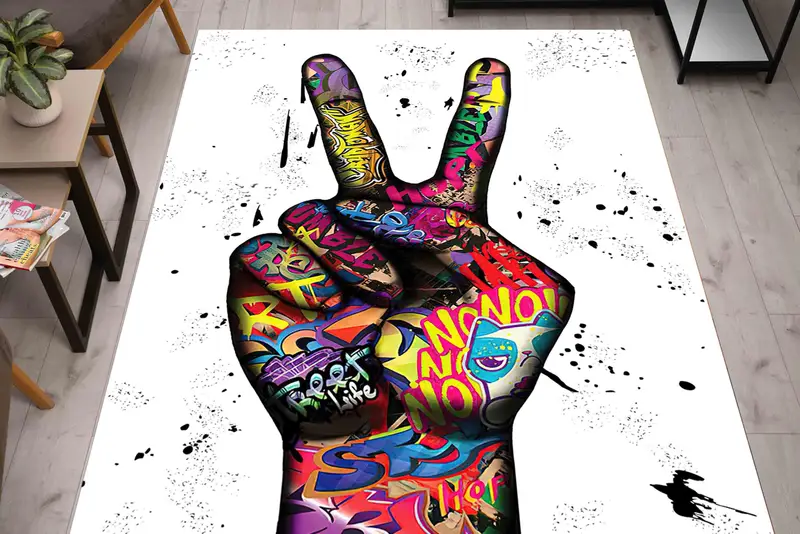 Peace Finger グラフィティ プリント ラグ: カラフルでトレンディーなストリート アート装飾