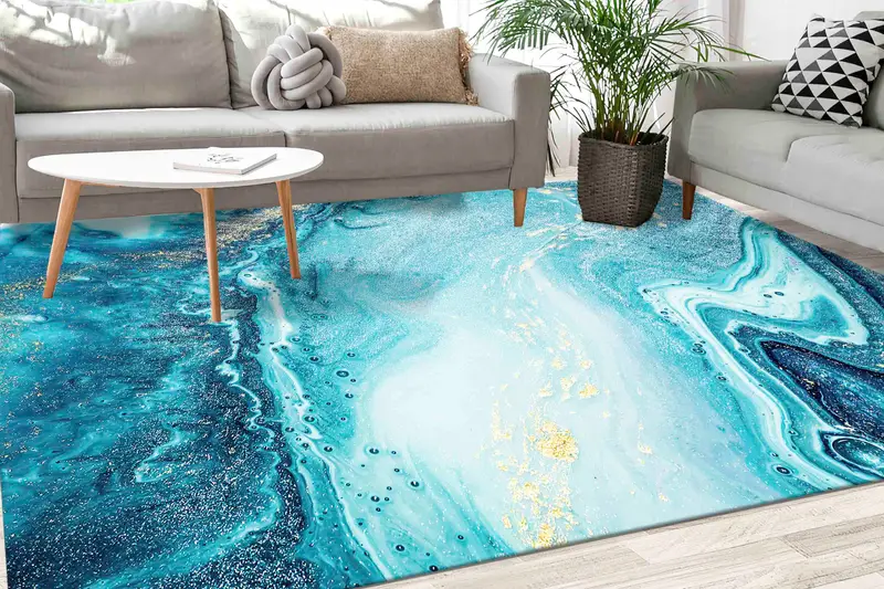 ブルーマーブルコンテンポラリープリントラグ、豪華なデザイン、ソフトな質感
