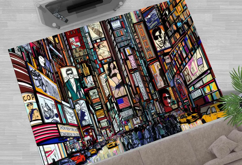 アーバン タイムズ スクエア プリント ランドスケープ ラグ、モダンなニューヨーク デザイン