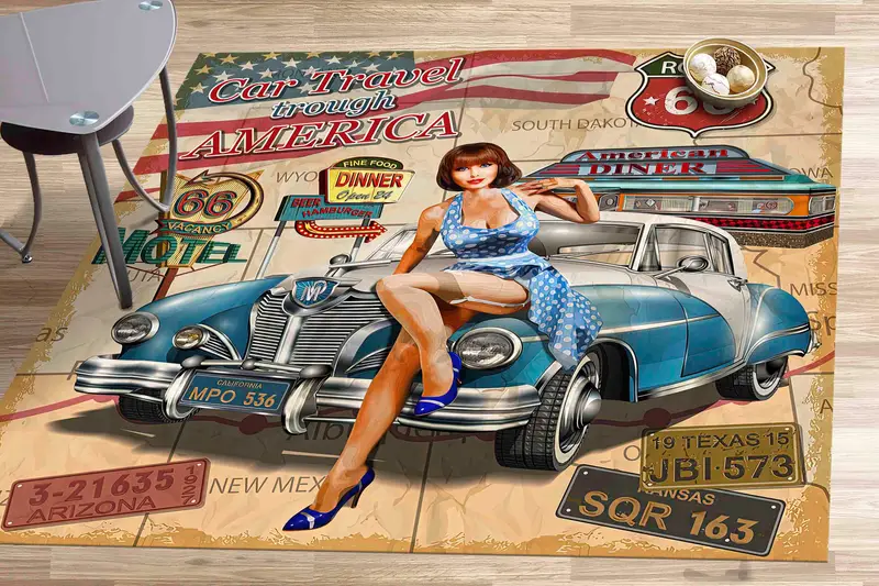 ヴィンテージカープリントラグ - レトロなアメリカンカーデザイン
