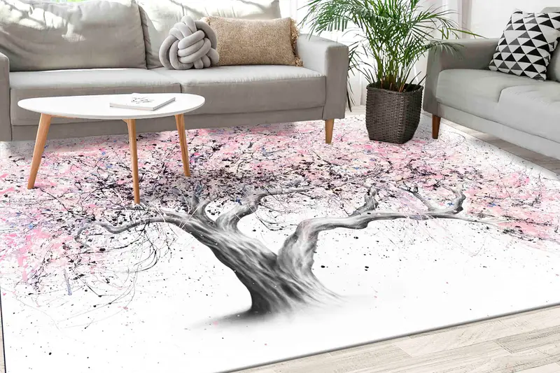 抽象的な木のピンクの葉の風景プリントラグ、現代的なデザイン