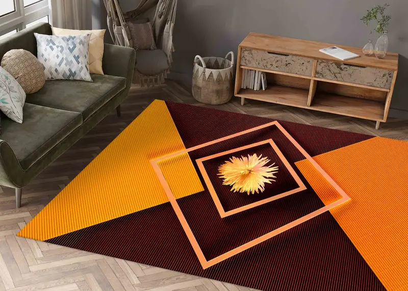 抽象的な花オレンジ幾何学模様のモダンなプリントラグ、鮮やかな家の装飾