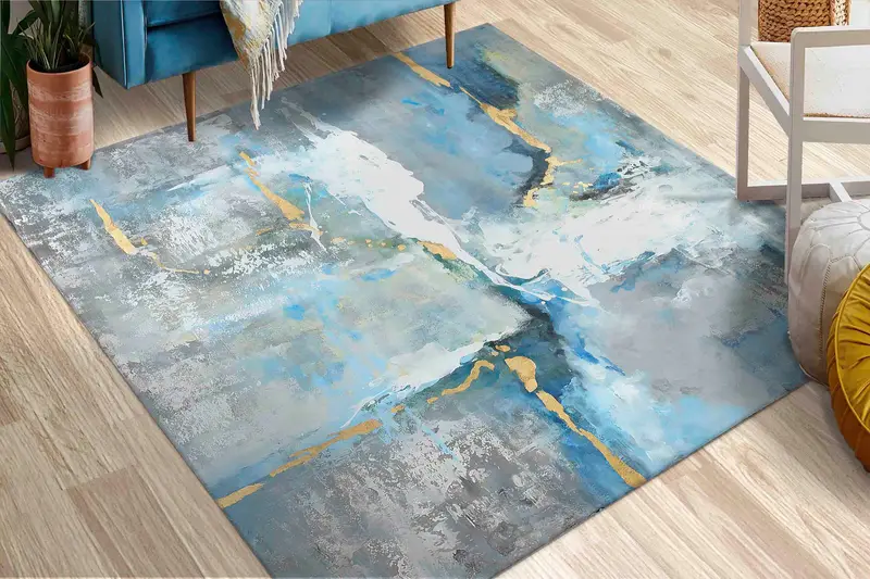 古い漆喰グレーとブルーの抽象プリント敷物、モダンなデザイン