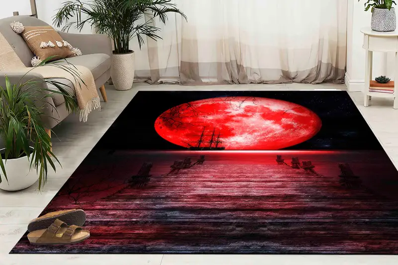 レッドムーンナイトランドスケーププリントラグ - モダンなシースケープデザイン