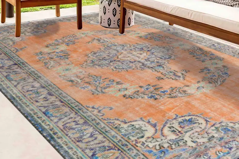 オレンジ & ブルーの花柄プリント ラグ: ヴィンテージ トルコ デザイン