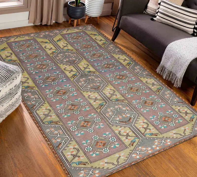 幾何学的なボーダーのヴィンテージ グリーン花柄プリント ラグ