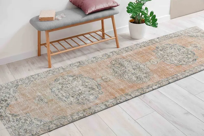 オレンジの花柄メダリオン ヴィンテージ トルコ プリント ラグ、モダン エレガンス