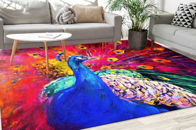 鮮やかなカラフルなピーコックプリントラグ - モダンなアニマルデザイン