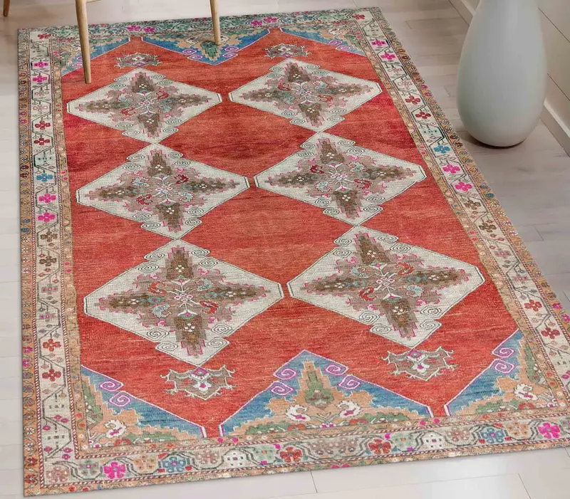 幾何学的なキリム模様の赤いヴィンテージトルコプリントラグ