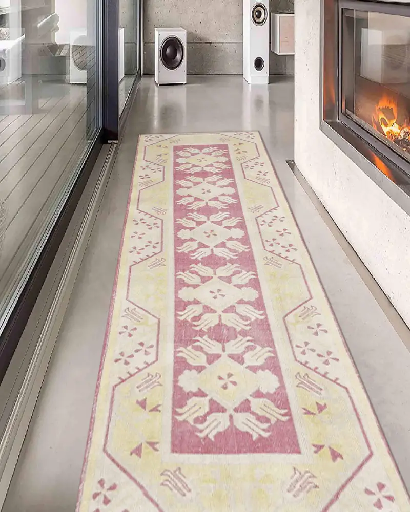 ナバホ族のアクセントが付いたピンクの幾何学模様のヴィンテージトルコプリントラグ