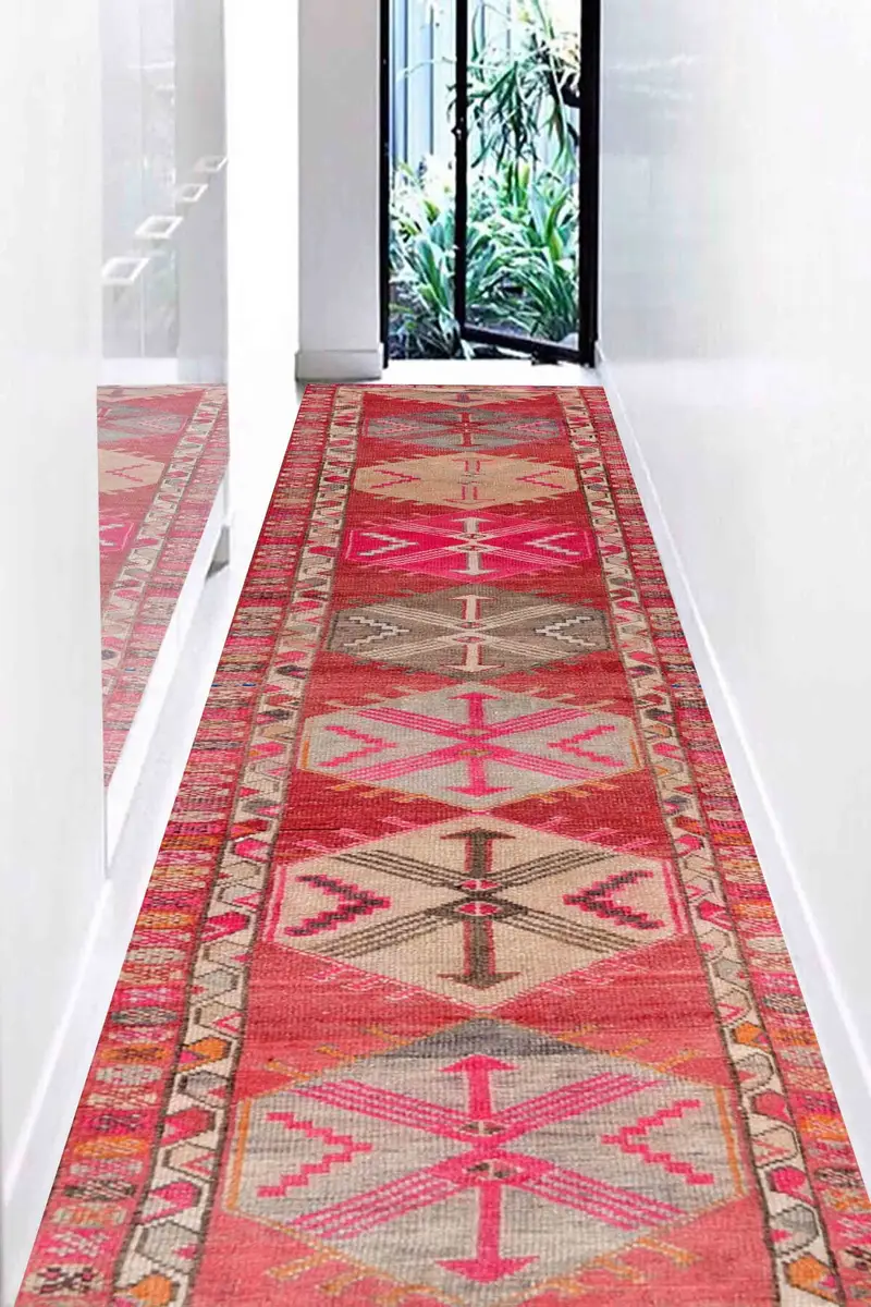 ヴィンテージ トルコ ピンク & レッド エスニック プリント ラグ、幾何学模様