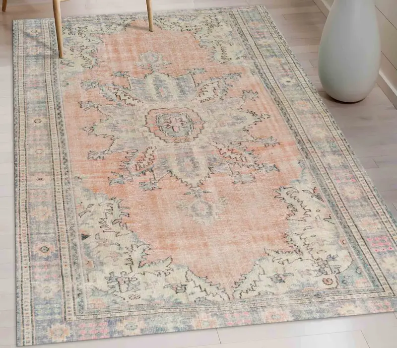 メダリオン ヴィンテージ トルコ オレンジ プリント ラグ (柔らかく落ち着いた色調)
