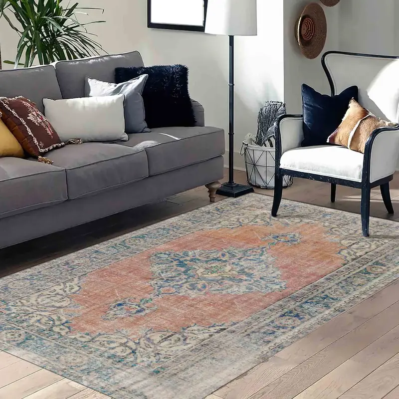 ネイビーブルーメダリオンヴィンテージトルコプリントラグ、ソフトファームハウス装飾