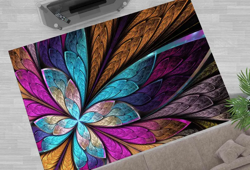フラクタル ブルーム モダン プリント ラグ: トレンディ、鮮やか、環境に優しい