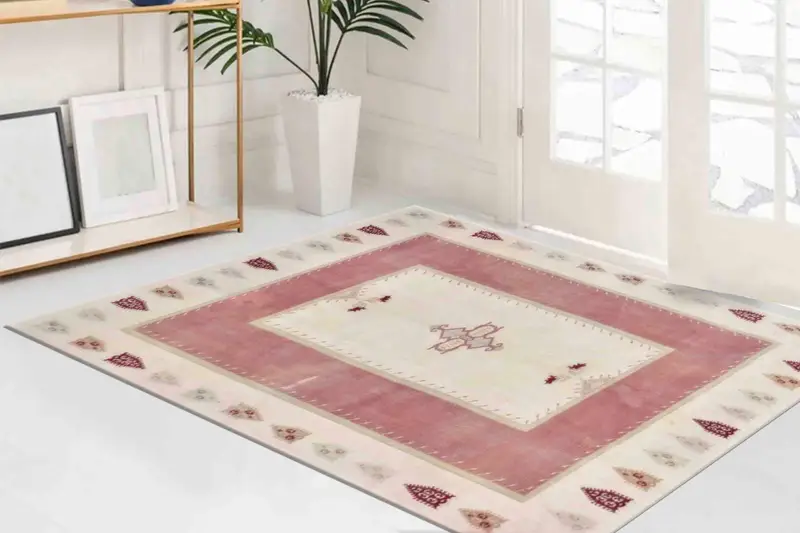 幾何学模様のミニマル ベージュ ヴィンテージ トルコ プリント ラグ