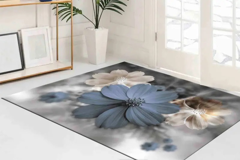 花柄プリントラグ: トレンディな青い花をあしらったモダンで贅沢なデザイン