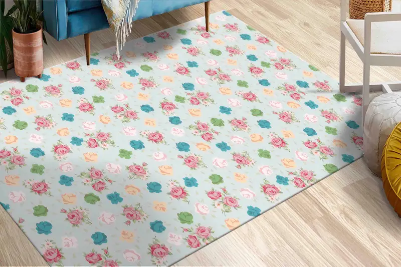 モダンな花柄プリントラグ: ピンク、グリーン、ブルーのソフトトーン