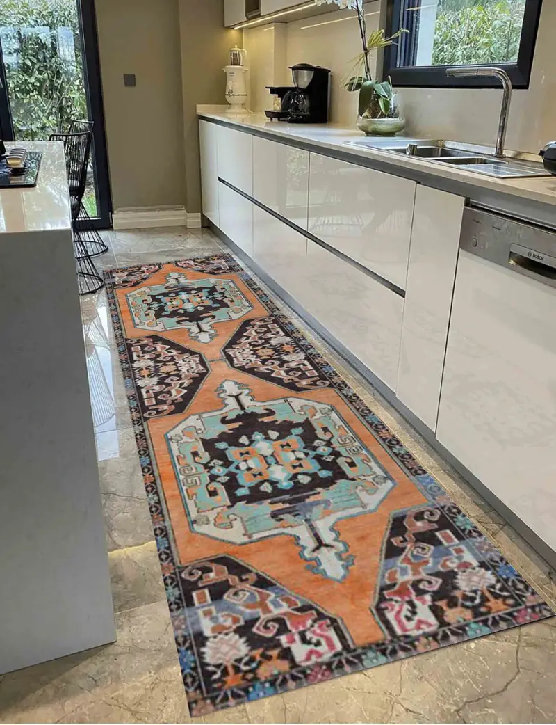 アステカ キリム パターン ヴィンテージ トルコ プリント ラグ、オレンジ & ブラック