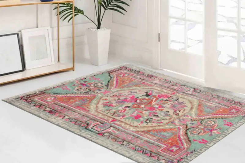 落ち着いたピンクと色あせたグリーンのヴィンテージトルコプリントラグ