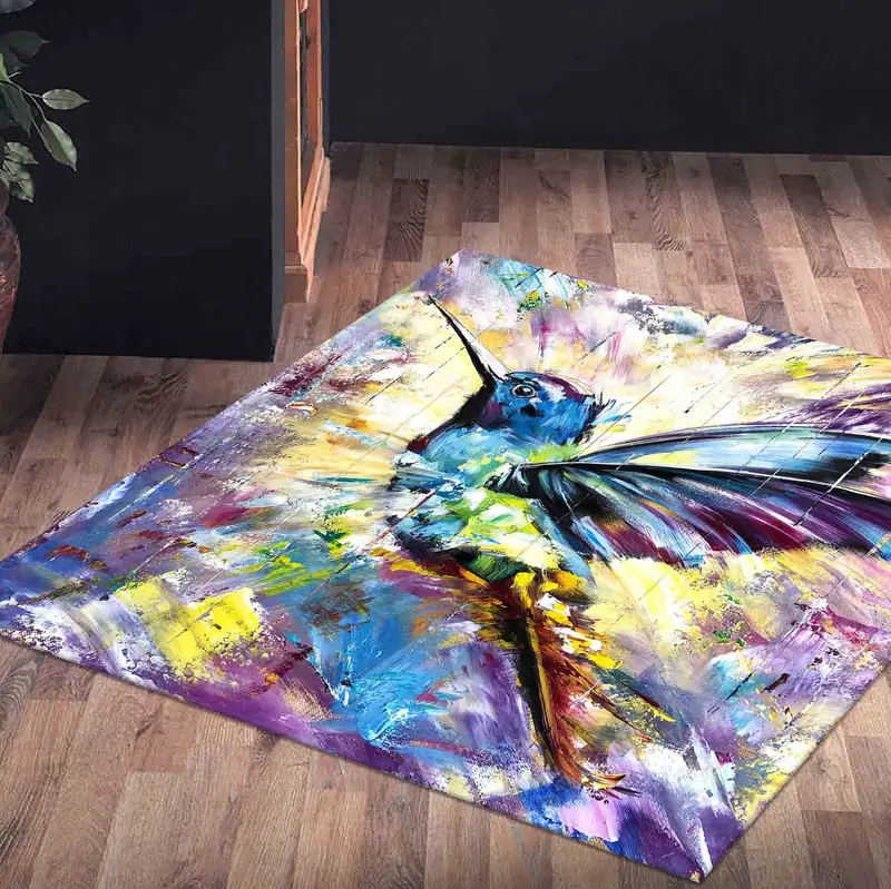 ハミングバードの鮮やかなプリントラグ: モダン、カラフル、抽象的なデザイン