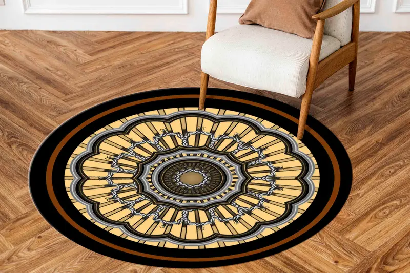 ブラックマンダラパターンラウンドプリントラグ、モダ...