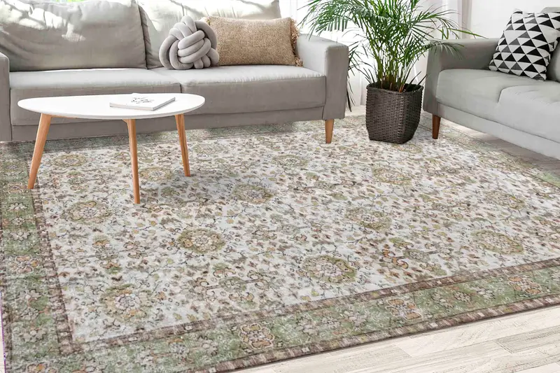 花柄エスニックデザインヴィンテージトルコプリントラグ、ブラウン&グリーン
