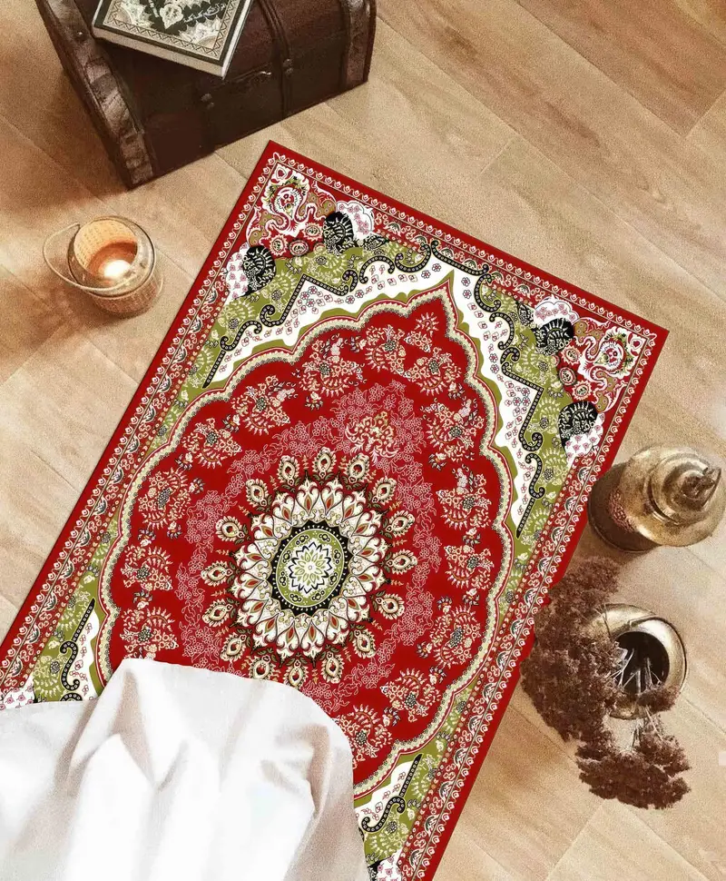 赤いスピリチュアルプリントラグ:礼拝用のオスマン帝国の祈りのデザイン