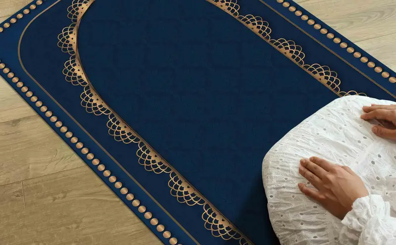 ネイビー ブルー ゴールド プリント ラグ: 豪華な祈りと礼拝のラグ