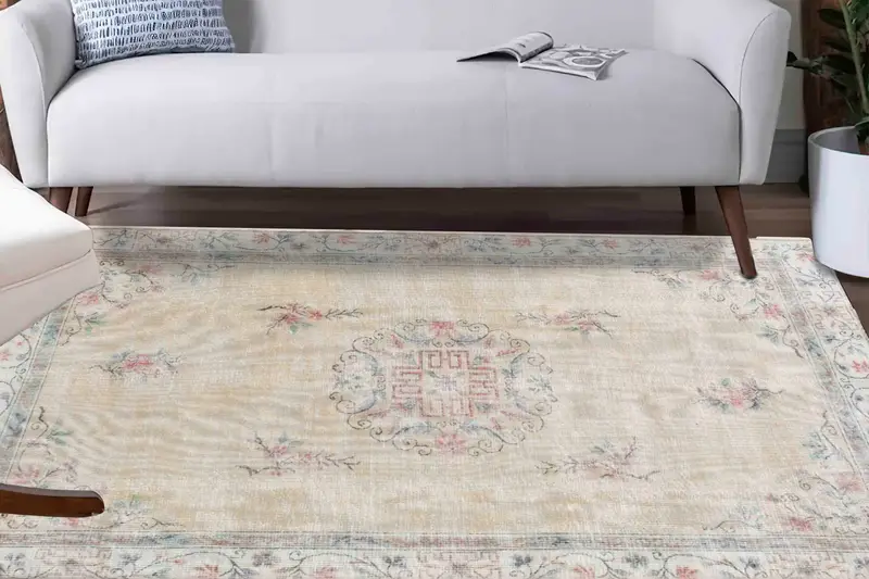 ベージュのヴィンテージ花柄プリントラグ - ソフトトーン、トルコデザイン