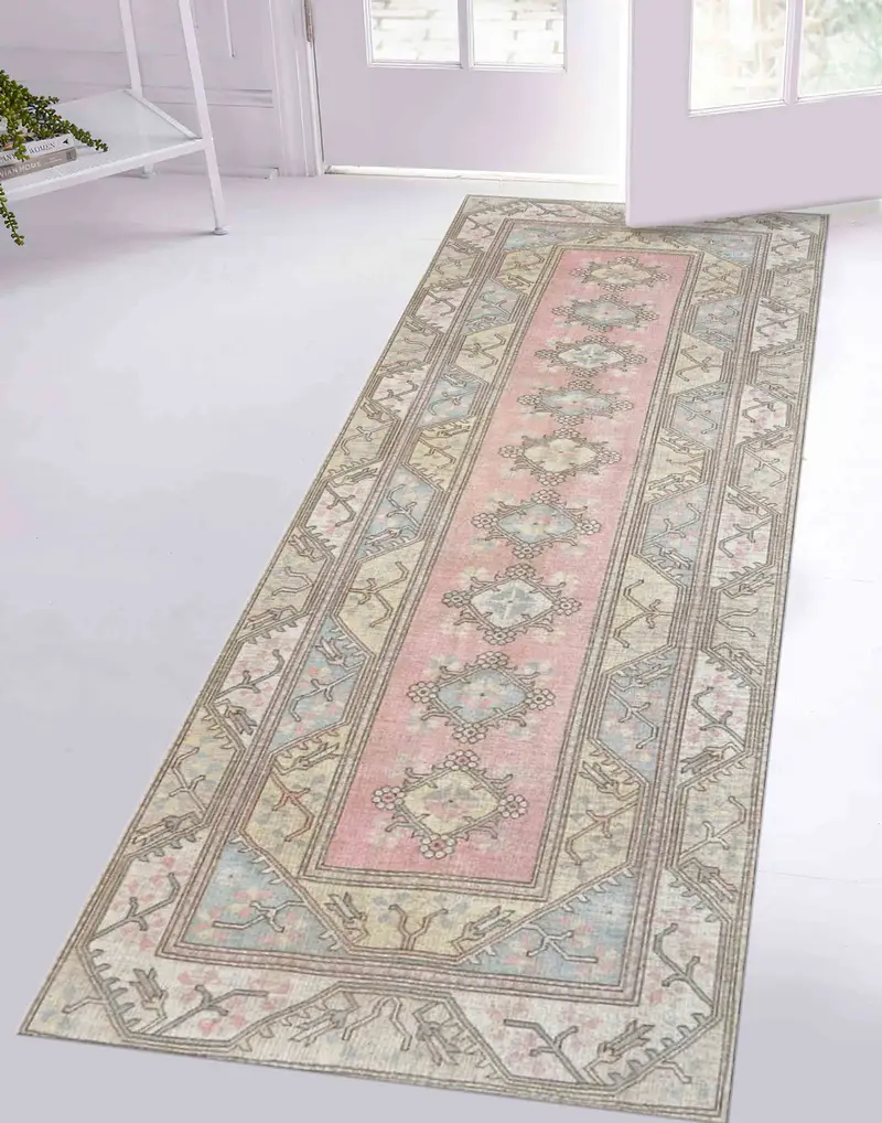 ヴィンテージトルコ花柄ラグ、ソフトトーン、アンティークデザイン