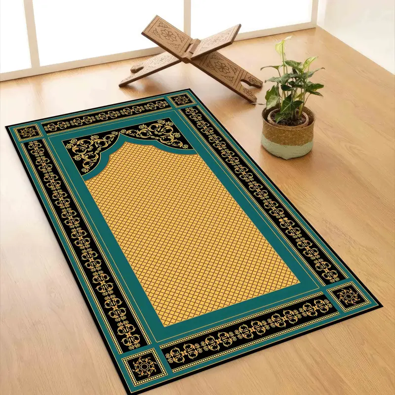 ゴールデンブルーの祈りプリントラグ:高級宗教的スピリチュアルデザイン