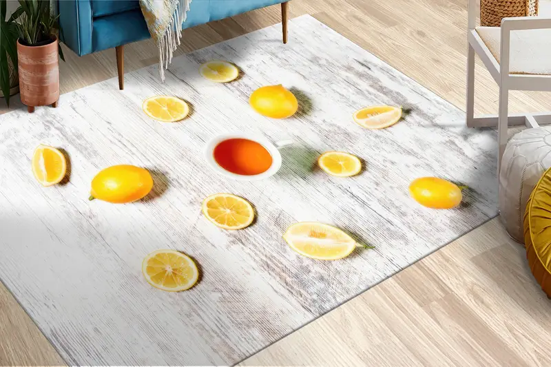 レモン柄のイエローモダンプリントラグ、トレンディな...
