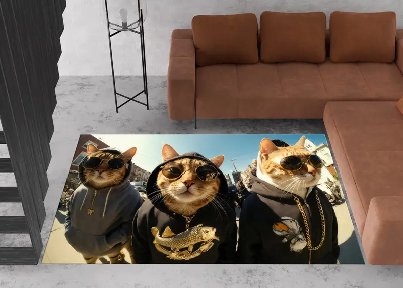 気まぐれな猫と帽子のプリントラグ、モダンな動物デザイン