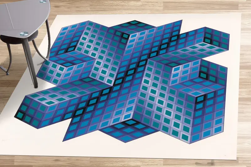 抽象的なブルーのプリントラグ: ヴァザルリ風のモダンなホームアクセント