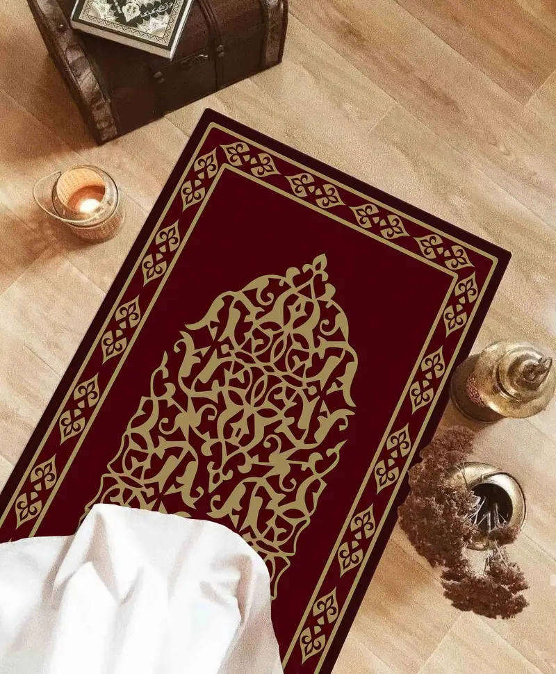 レッドスピリチュアルプリントラグ:神聖な空間のためのエレガントな祈りの敷物
