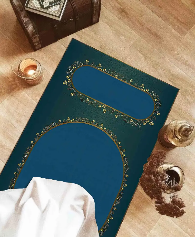 ブルー & ゴールド プリント ラグ: スピリチュアルな礼拝のためのエレガントなデザイン