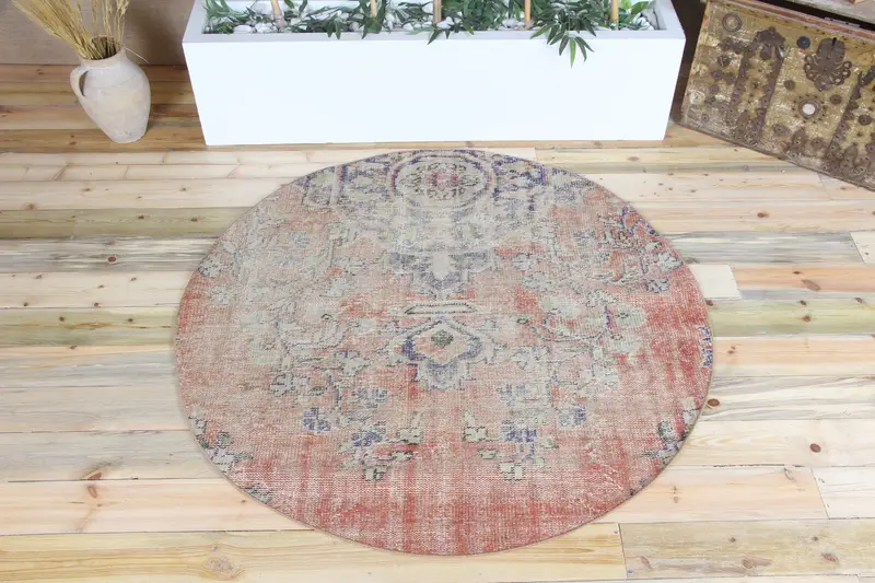 4.9x4.9フィートトルコヴィンテージラグ、ラウンドラグ、レッドラグフローラルラグ