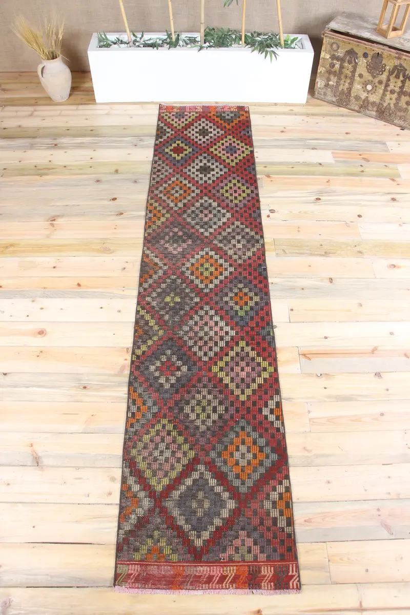 2.1x10.3フィートトルコヴィンテージラグ、ランナーラグ、レッドキリム幾何学ラグ