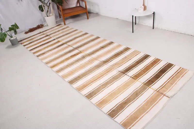 トルコラグ、3.9x11.2フィートランナーラグ、ブラウンホワイトキリムウールラグ