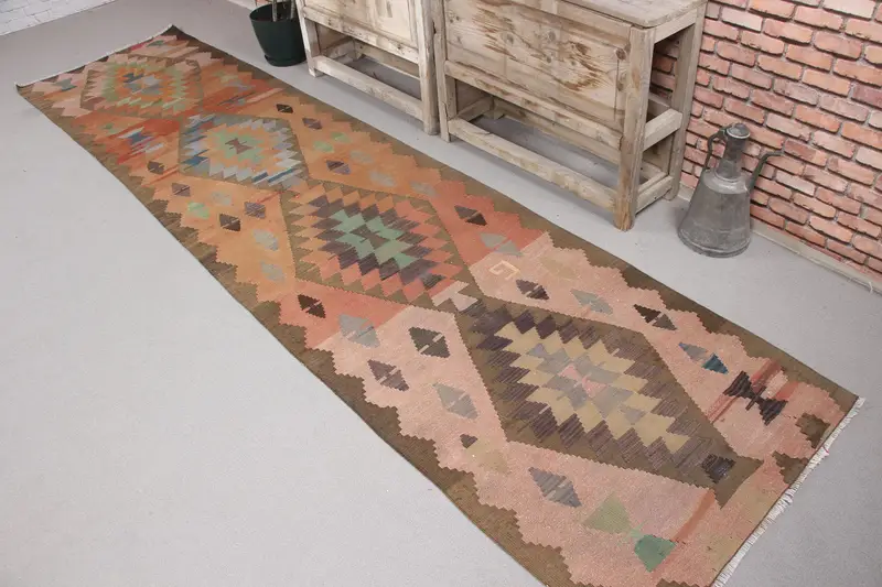 ヴィンテージ ターキッシュ ランナー ラグ 2.7x11.1 フィート、ブラウン オレンジ フローラル ラグ