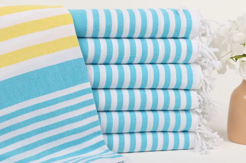 ブライダルシャワー記念品 イエローターコイズストライプコットンタオル 36x67インチ