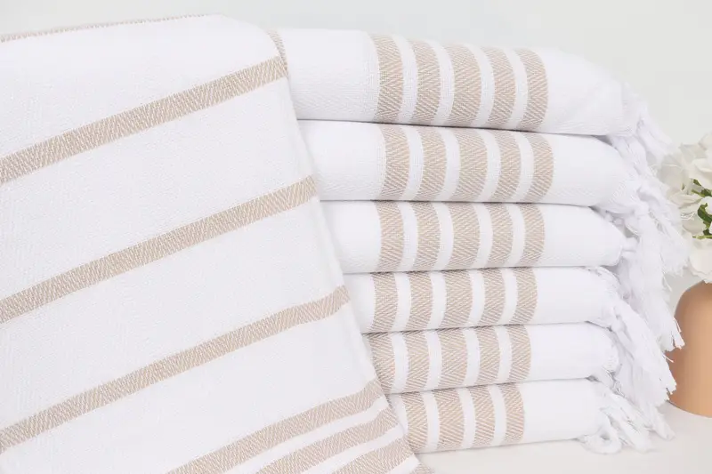 ベージュコットンハンドタオル、Sサイズバスタオル、ヘリンボーン、24x36インチ