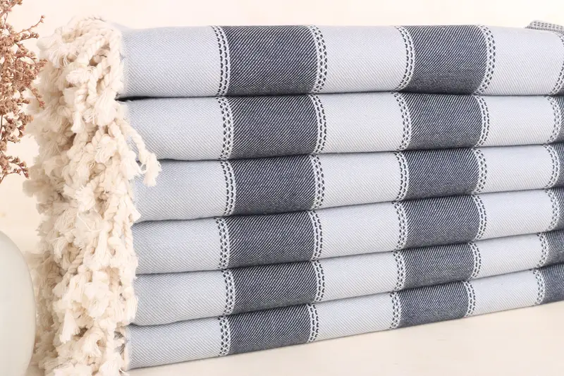 各タオルは正確な構造を示し、寸法は最も近いセンチメートルまで測定され、一貫性と品質が保証されています。手織りプロセスでは 1 ~ 2.5 cm の誤差が許容され、各ピースの職人の品質がさらに強調されます。この細心の注意を払ったプロセスにより、耐久性と美しさを兼ね備えた製品が生まれます。