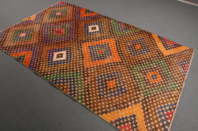 ヴィンテージ トルコ エリア ラグ 4.6x7.4 フィート、キリム ブラウン ウール ラグ